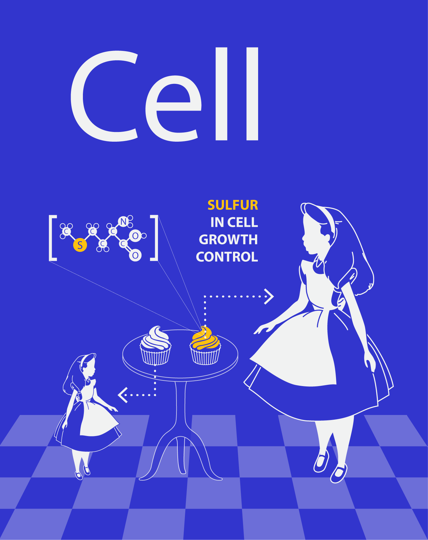 This Cell cover image highlights an important discovery of a new cancer cell growth mechanism that depends on sulfur. Illustration uses analogy from the "Alice's Adventures in Wonderland". Cells that get a lot of sulfur grow big in size, just like Alice when she ate one of the "eat me" cookie. Similarly, another (sulfur free) cookie makes Alice (cancer cells) shrink and undergo self-cannibalism, aka - autophagy.